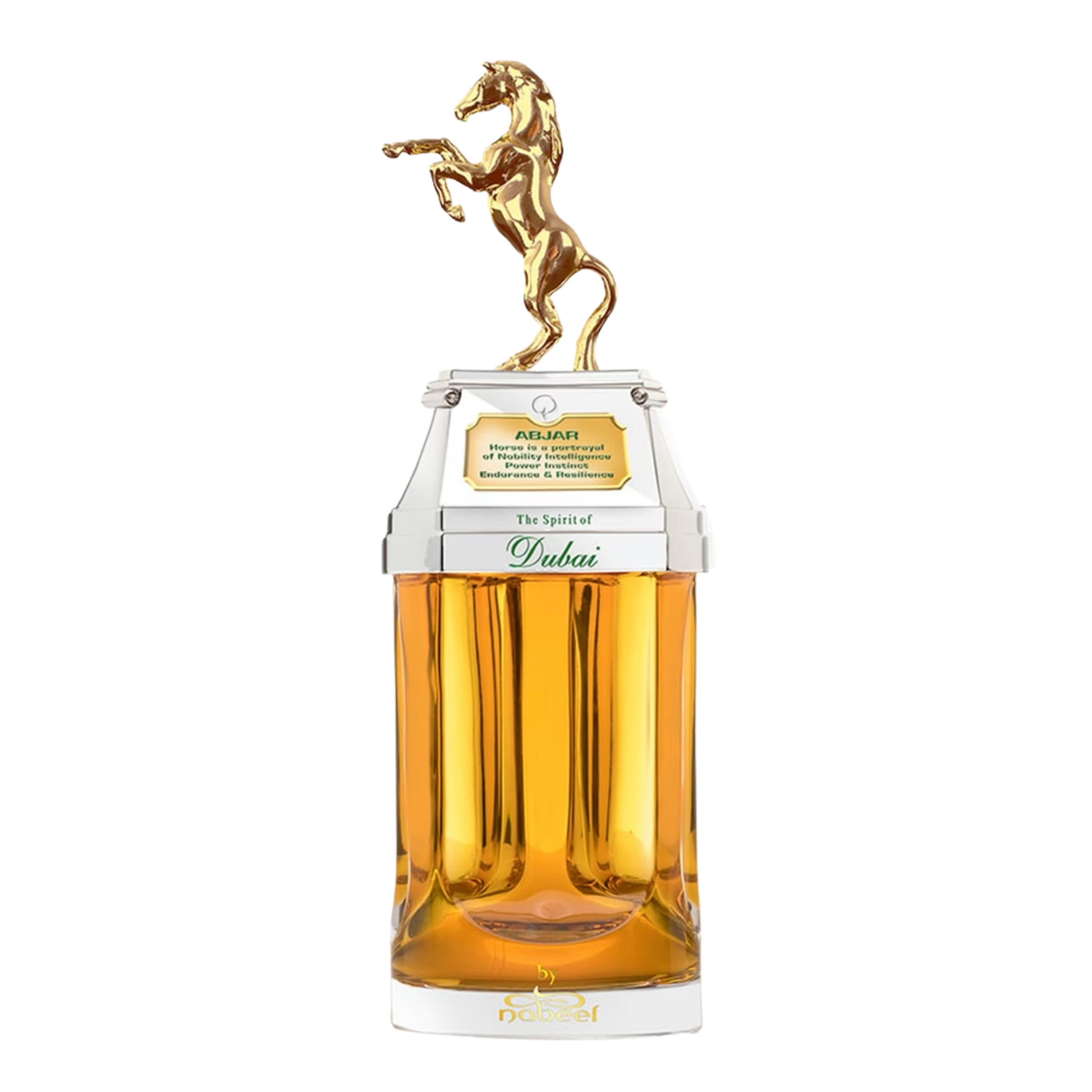 As regal as the scent itself, The Spirit of Dubai Abjar comes housed in a visually stunning bottle that reflects the power and elegance of the Arabian stallion it honors. Sculpted with meticulous detail, the bottle features rich gold accents and artistic flourishes reminiscent of Dubai’s opulence and heritage.