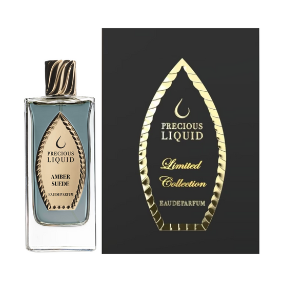 The packaging of Precious Liquid Amber Suede reflects the opulence of the fragrance itself. The sleek, modern bottle design is both elegant and minimalistic, with clean lines and a luxurious gold accent that enhances its sophisticated appearance. The transparent bottle reveals the rich amber color of the perfume, a visual representation of the warmth and depth contained within.