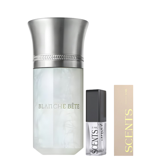 The bottle of Blanche Bête mirrors its scent—pure, radiant, and elegant. Designed in the classic Liquides Imaginaires flacon, the cylindrical bottle evokes the shape of ancient vessels used for sacred rituals. Its white and silver accents speak of purity and transcendence.